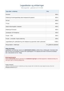 Informasjon og priser på ulike legeerklæringer og attester ser du nedenfor. Her finner du oversikt over tilgjengelige erklæringer, hva de gjelder og gjeldende priser.